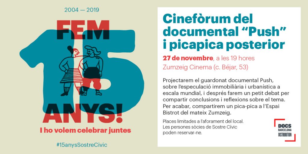 Projectarem el guardonat documental “Push”, sobre l’especulació immobiliària i urbanística a escala mundial, i farem després un petit debat per compartir conclusions i reflexions sobre el tema. Per acabar, compartirem un pica-pica a l’Espai Bistrot del mateix Zumzeig.
