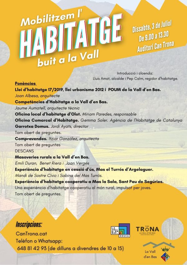 El proper 3 de juliol, l’Ajuntament de la Vall d’en Bas organitza a Can Trona una jornada per tal de mobilitzar l’habitatge buit que hi ha al municipi. Durant la jornada, que començarà a les 9 del matí, es farà un repàs del marc legal i els diferens mètodes de compra, venda i lloguer d’habitatge amb persones que explicaran els seus casos pràctics.