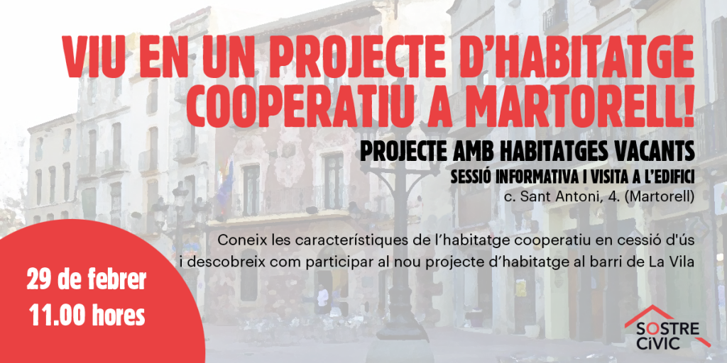 El dissabte 29 de febrer a les 11h farem una sessió informativa i una visita als habitatges que recentment ha adquirit Sostre Cívic al barri de La Vila a Martorell. En aquest document informatiu es pot consultar tota la informació rellevant de Sostre Cívic, les característiques de l’edifici i dels habitatges, les condicions i requisits d’accés i tota aquella informació rellevant per accedir-hi.