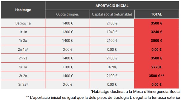 - L’aportació inicial està formada per la quota d’ingrés, que abona tota persona sòcia a qui se li adjudica un habitatge de la cooperativa, i l’aportació de capital social, que és retornable en cas de baixa.