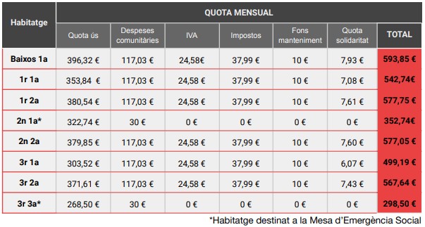 - Les quotes mensuals no són retornables, i inclouen la quota d’ús de l’habitatge i altres despeses. Les altres despeses són: