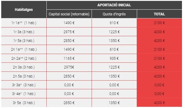 - L’aportació inicial està formada per la quota d’ingrés, que abona tota persona sòcia a qui se li adjudica un habitatge de la cooperativa, i l’aportació de capital social, que és retornable en cas de baixa.