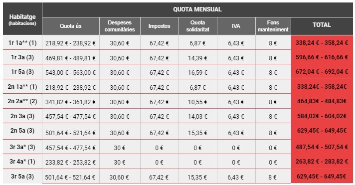 - Les quotes mensuals no són retornables, i inclouen la quota d’ús de l’habitatge i altres despeses. Les altres despeses són: